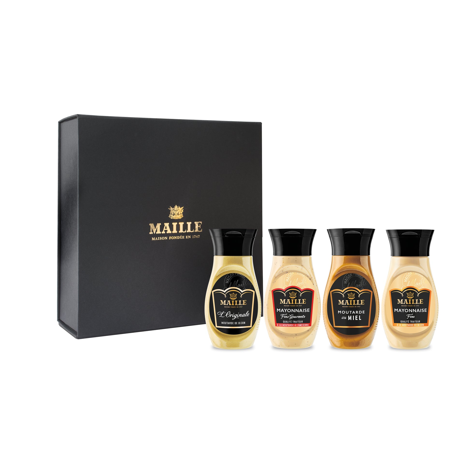 Présenté dans un coffret noir élégant, ce quatuor de classiques est une idée cadeau parfaite à l’occasion d’un dîner, d’un week-end chez des amis ou simplement pour se faire plaisir. Il s’inscrit dans la tradition d’excellence de Maille : faire de chaque repas un moment singulier.