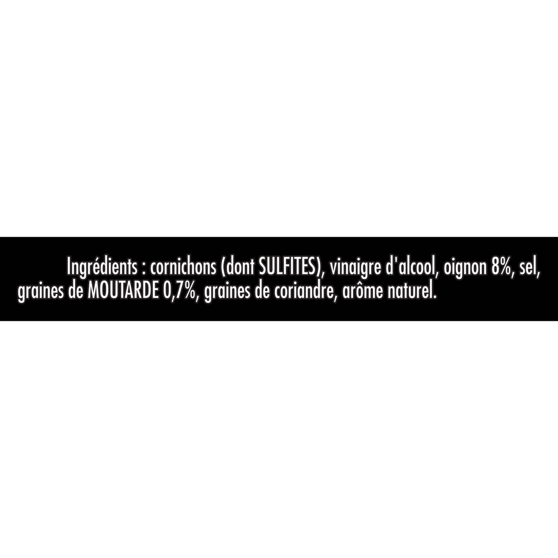 cornichons (dont SULFITES), vinaigre d'alcool, oignon 8%, sel, graines de MOUTARDES 0,7%, graines de coriandre, arôme naturel.