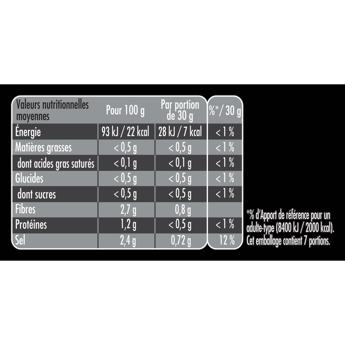 *% d’Apport de référence pour un adulte-type (8400 kJ / 2000 kcal). Cet emballage contient 7 portions.