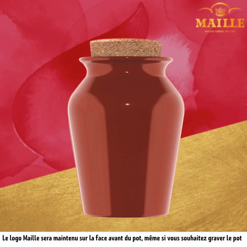 • Servie à la pompe dans un pot en grès fabriqué en France (en Bourgogne) et emballée dans un joli étui cadeau noir arborant le logo Maille doré.