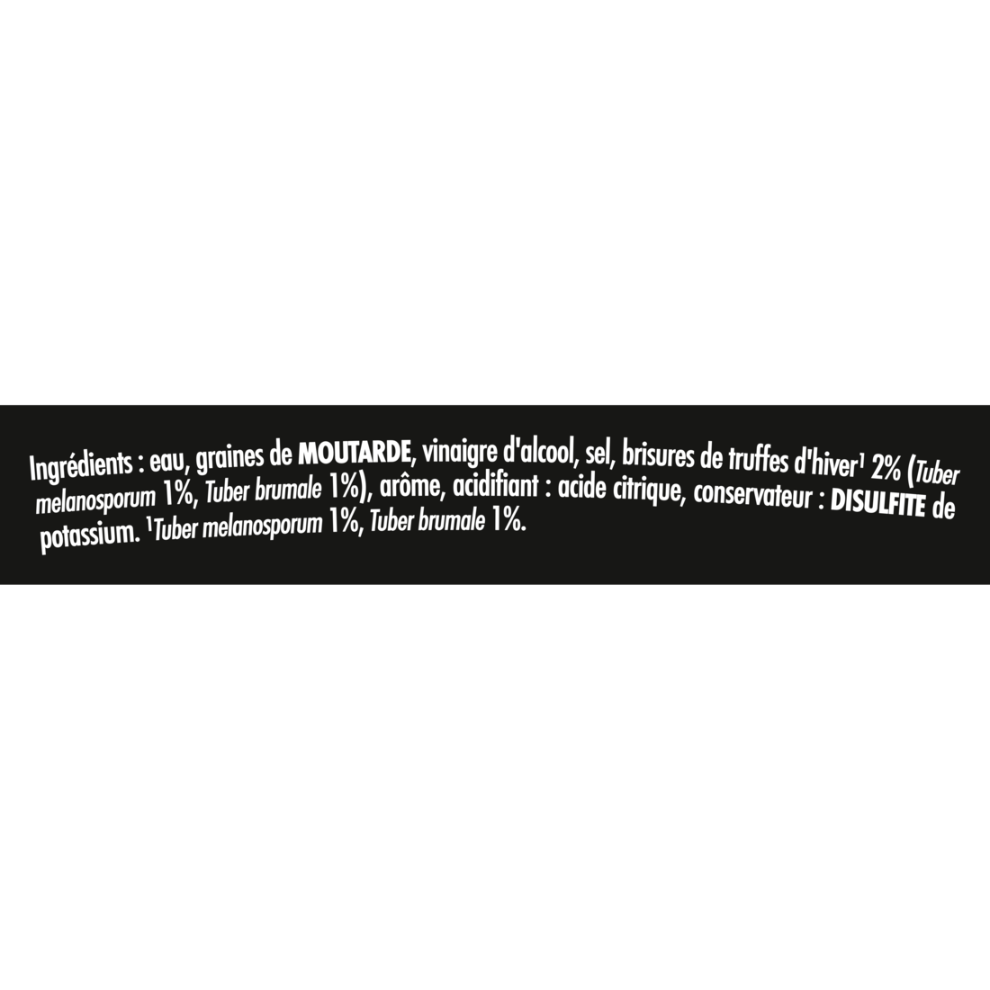 d'hiver¹ 2% (Tuber melanosporum 1%, Tuber brumale 1%), arôme, acidifiant : acide citrique, conservateur : DISULFITE de potassium.