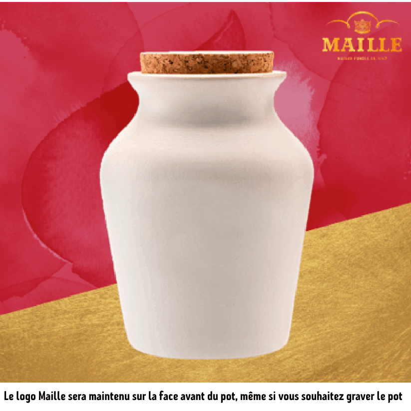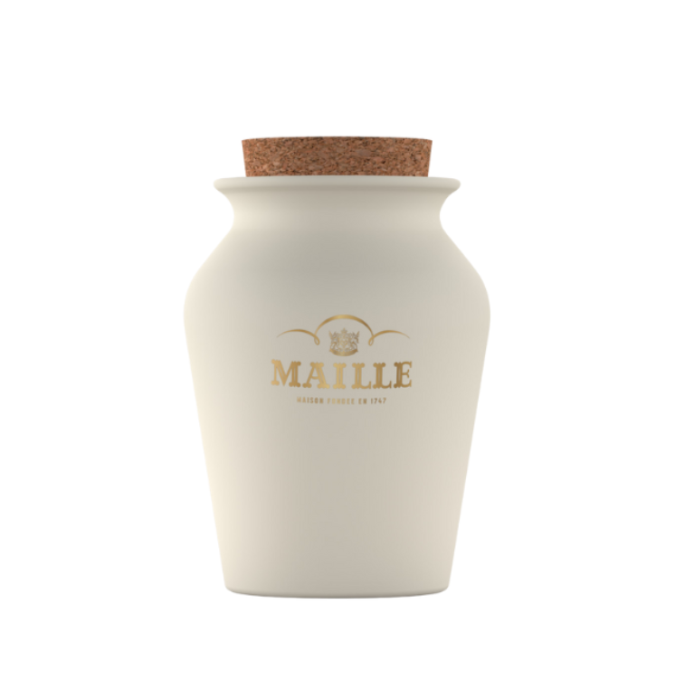 - Servie à la pompe dans un pot en grès fabriqué en France (en Bourgogne) et emballée dans un joli étui cadeau noir arborant le logo Maille doré.